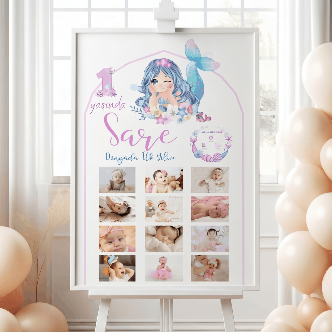 Deniz kızı temalı kişiye özel 1 yaş doğum günü anı panosu. 12 ay fotoğraflı kolaj tablo olarak hazırlanır. Bebek doğum bilgileri (tarih, kilo, boy, saat) eklenir. Çerçeveli özel tasarım bebek odası tablosu ve doğum günü konsepti süsü olarak kullanılabilir.