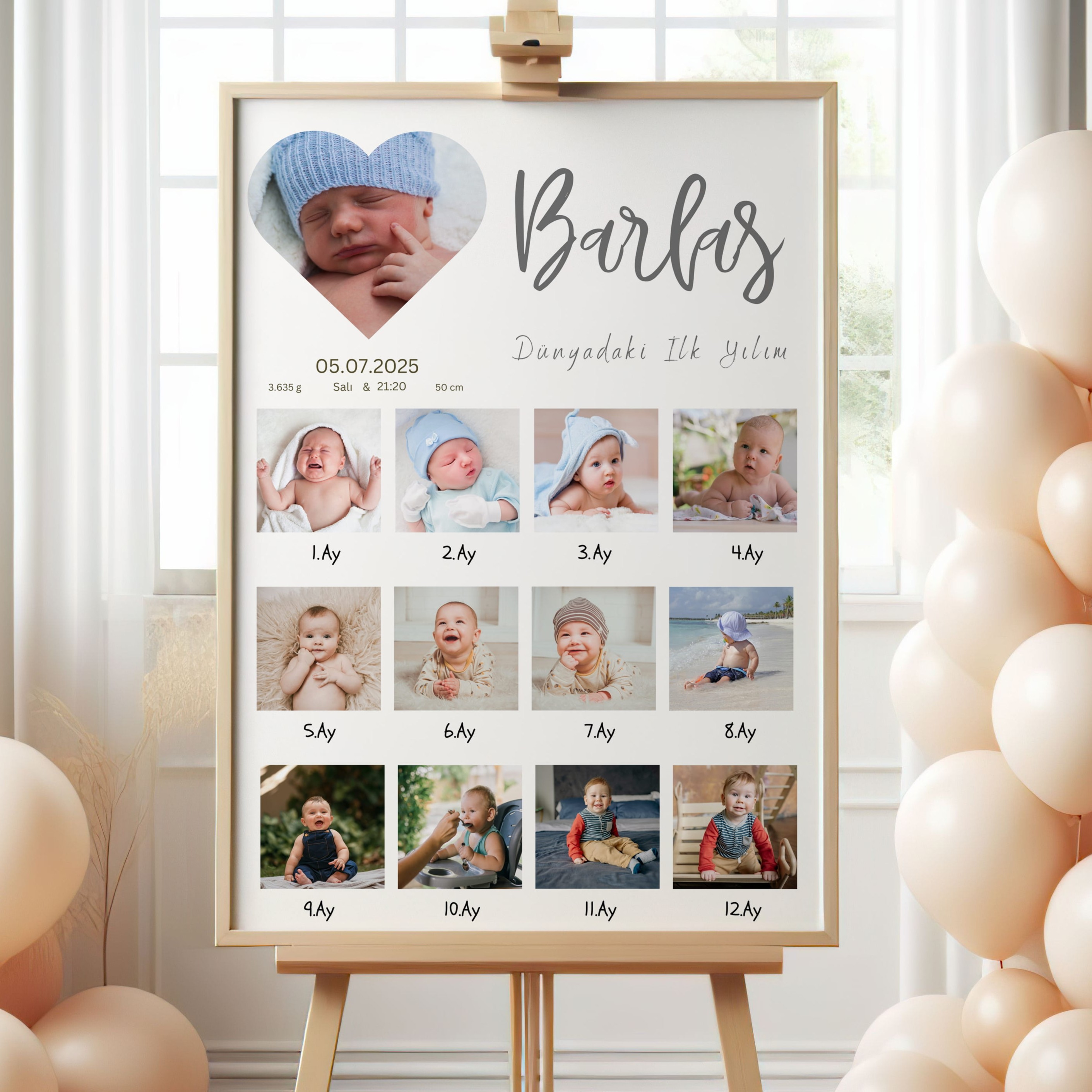 Kalpli tasarımlı 12 ay fotoğraflı bebek anı panosu. Kişiye özel çerçeveli tablo olarak hazırlanır. Doğum tarihi, saat, kilo ve boy bilgileri eklenir. Erkek bebek doğum günü konsepti için idealdir.