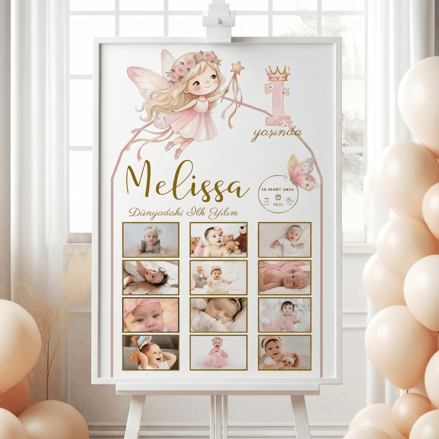 Peri kızı konsepti ile tasarlanan bu özel ürün, 1 yaş doğum günü konsepti için hazırlanmış kişiye özel tablo modelidir.