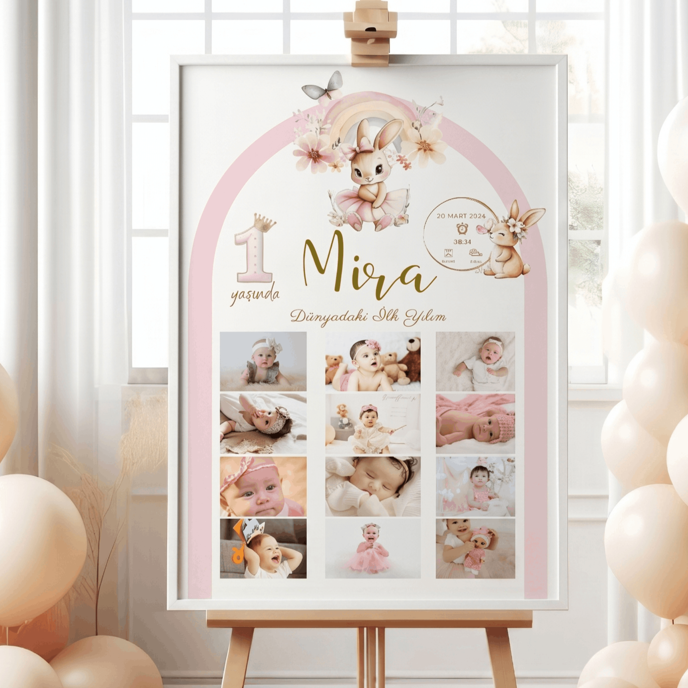 Bebeğinizin ilk yılına ait fotoğraflar ile oluşturulan fotoğraf kolaj tablo, hem doğum günü masa süsleri hem de kalıcı bir anı olarak kullanılır.