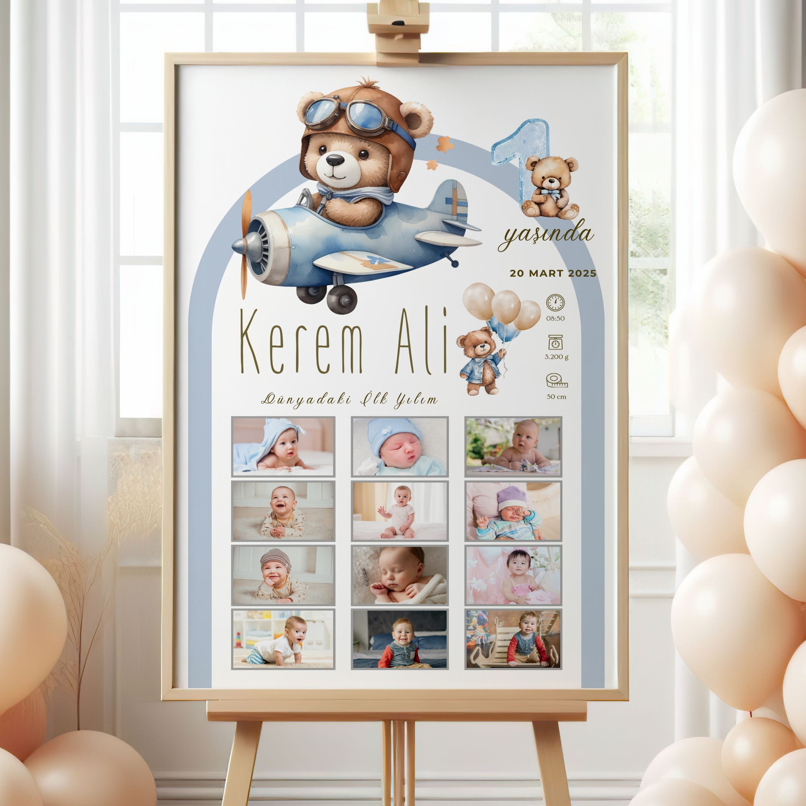 Uçak temalı 1 yaş doğum günü konsepti için özel olarak tasarlanan bu bebek anı panosu, bebeğinizin ilk yılına ait 12 fotoğraf ile hazırlanan kişiye özel hatıra tablosudur. Erkek bebek doğum günü süsleri arasında en çok tercih edilen ürünlerden biridir.